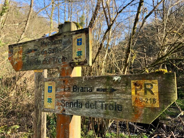 Esta senda recorre los caminos del carbón en el Valle del Río Candín, afamado ya por su riqueza carbonífera en el siglo XVIII. Debemos dirigirnos al poblado minero de La Braña, a 2 km. de Tuilla/Tiuya, donde detenernos a pasear entre los vestigios de la explotación minera que dio origen al pueblo y estuvo en funcionamiento hasta los años 40 del pasado siglo, con su bocamina, las edificaciones anexas hoy convertidas en viviendas y los cuarteles obreros que datan de 1917. Destaca la boca de ventilación "La Braña", con una entrada a la galería de la mina rematada en sillares de piedra y la boca circular en un nivel superior, construidas en 1957 por la Sociedad Metalúrgica Duro Felguera.